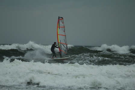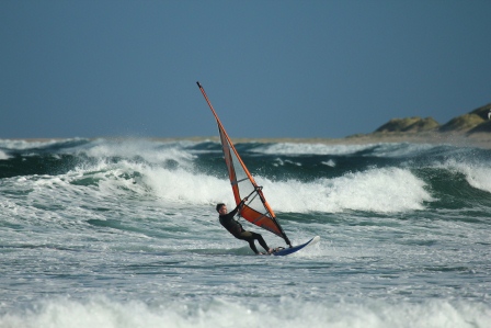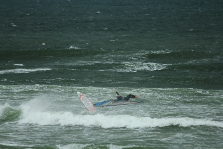 Minty tried for a repeat at Dooeys again in the waves. All week he'd been practising his jump off the kit and fly manoeuvre - fine if you're in the middle of an arial move, but not so clever if you've just mucked up a turn or a gybe in the impact zone. Rule 1 of wavesailing is always to hang onto (and save) your kit. Determined to prove what a good rule this is, he repeatedly sprang off his kit and sure enough eventually his mast stuck in the ground and broke in two. The second part of his plan, to wallow in the water while waves broke over his head for 20 minutes was ruined by Mr Wookie who took off the from the top of the sand dune like a hirsute Pamela Anderson and ran bobbling down into the waves to help him out. Now if only Wookie had been wearing a red bikini - that would have sorted the sharks out.