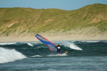 The next 3 days were spent at Magheroarty, mostly on great waves but also some tuning up sessions on Ballyness Bay - the tidal flat bit behind the main beach. Tuesday and Wednesday were 5-5.5m sails for most people although various lightweights used 4.5m or so. At one stage we counted 30 sails on the beach, so clearly it wasn't crowded. Waves were good, which means relatively few problems going out and every now and then a set of 3 monsters would come in and eat someone. Nicely spaced and cross off winds.