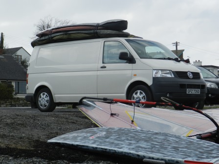 And more recently the LTD have been out on most Wednesdays. The strangest by far was this week when the lure of an easterly dragged us to Ballywalter. It had been a bit of a road trip to various locations and all the time the wind was dying. So at by the time the cavalcade reached Ballywalter it was pretty grim. And so it was that big kit went sort of wavesailing. I look 9.4m on a Falcon (semi formula board) while Ming put 9.4 on his full formula. Getting out through the shore break and relatively small waves in very little wind and with big vulnerable kit certainly kept the locals amused. However once we'd struggled out clear of the shore the wind was cleaner and a lot stronger. So we dashed about slapping merrily on waves and wondering whether our knees would explode before our kit did. It's wave sailing Jim, but not as we know it.