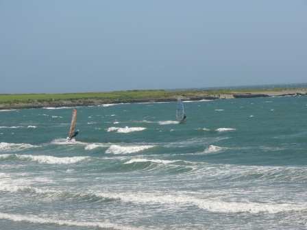 Sunday - day 2 - then was a little lighter but definitely more up and down. Ming the Merciless, Ronnie Lough and Trevor 'babe magnet' Pollen were first out on around 6ms. They had a good sail but complained of it being on and off. Ming stayed and clocked over 32 knots so when it was on it was very on. In fact it was really 7m weather but frequent and sometimes prolonged squalls were coming through making life 'interesting' to those hanging on to larger sails. I hit a modest 26 knots while bouncing over waves wildly out of control on 120ltrs. Bin Laden by then had retrieved his kit and was once again on 110 and 6m. Even Pat's ducklings appeared, despite being deserted by their mother duck, and Dave 1, Dave 2 and Kate sailed. There was also a lot of water start practising going on in the shallows - clearly the ducklings are getting better.