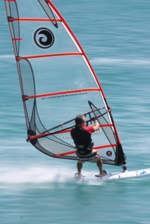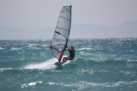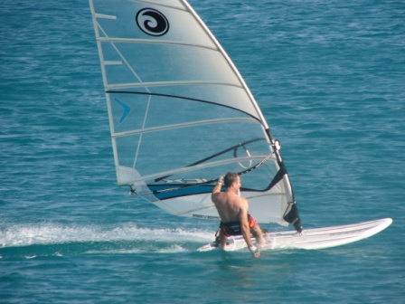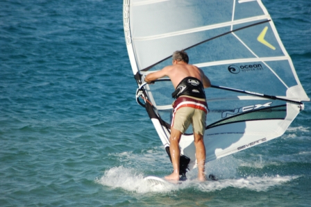 By now Thomas has remembered how to windsurf and is showing us up. On the right Pat skims at speed