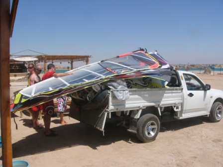 I mentioned the wave beach and this turned out to an epic journey (twice) and some lovely conditions. The hotel and centre are on a peninsula and the wave beach is on the other side, but it's about a mile away. So on the 2 days when the wind was really good, around 10 windsurfers and all of the kit they could possibly need was loaded onto, and I do mean onto, 2 taxis and driven in the usual Egyptian hairy driving fashion to this desolate beach. I should explain that these taxis were pickups but you should see the pictures of say 10 boards, 10 sails, booms and 5 sailors on top about to be rattled and bashed along the roads to the wave beach. But it was worth it, we had 2 great days there. I was on a 5.2 and very well powered, Wookie on 4.5 sailing with his usual distain. Colin sailed well until he took off on a jump - all his jumps were massive - but pulled his foot out of the strap on the tuck up. We all know that horrible feeling when it's going to be gonads or groin. In his case it was groin as he did a massive split and felt so sore he didn't sail for the rest of the day.