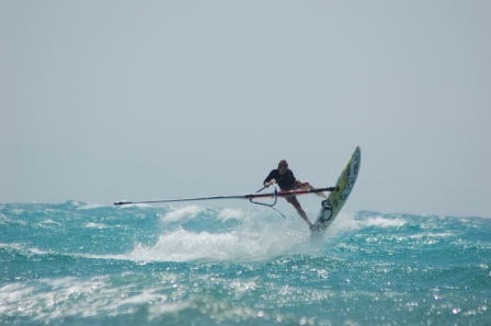 The one thing the Hobbits said was don't go too near the reef and to be fair I didn't think I was. The conditions were very like Magheroarty on a nice (rather than epic) day and there was some good wave catching and gybing on wave faces going down. The waves of course were biggest (well over mast high) near the reef. I lost a gybe and next thing I know there are rocks under my (bare) feet and I'm being pounded into the reef by a series of waves. Oops! Fortunately I water started after only 4 poundings and sailed out of it. Suffice to say I didn't go so close again. The problem at the wave beach is that there's no rescue cover. On our second day one of the Leathermen (UK south coast sailors) hit the reef, lost his skeg and had to carry his kit in onto the reef. Not pretty!