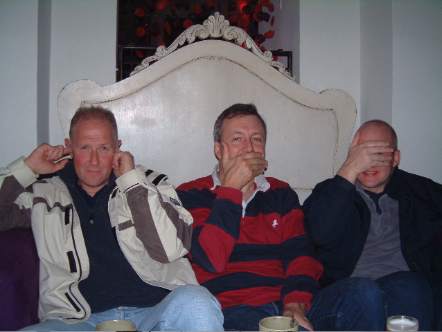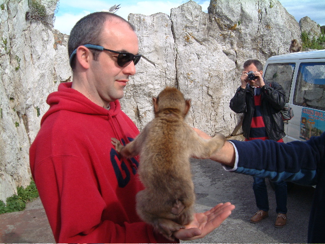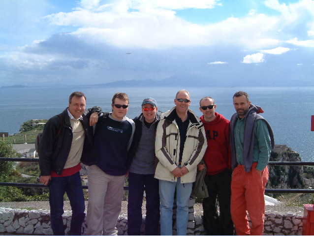 The highlight of the holiday came the next windless day. Even the Alarm Clock gave up. So we pointed our wagon at Gibraltar and went tourist. It's pretty odd to leave Spain (on foot) and then get a taxi across the main runway of the airport. Fortunately no planes were coming in, otherwise they might have landed on Andy by mistake. We paused only as long as it took Tony Egerton to realise that the duty free prices for the many gadgets on display were way high before taking the tourist taxi to the top of the rock. You can imagine the scene, Andy and Wookie looking so cool in their shades, Robbie looking - well how do you look in orange pants. And the monkeys came out and to our great joy one junior one climbed the Wookie. Cameras rolled, there it was, meet the family time. Until the Monkey peed on the Wookie (we think it was that way round). Have you ever seen William when he's angry? The monkey was bounced on its head, but it was too late - just wait until you see the photographs. Wooks was wearing a GAP top, now rechristened Great Ape Piss. I guess you just had to be there.